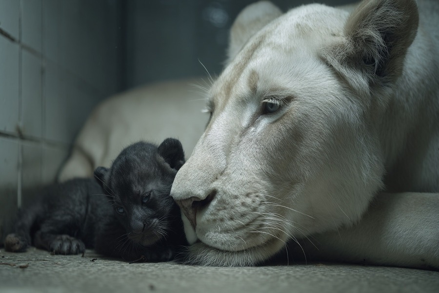 漆黒の仔が生まれた直後、エミリーは園内の空気が一変したのを感じました。直接声が届かないはずの遠くの檻からも、動物たちが低く唸る声や、落ち着きなく歩き回る気配が消え、不自然なほどの静寂が広がったのです。嵐の音だけが響く中、母ライオンは戸惑うように漆黒の仔を鼻先で転がし、ようやく愛おしそうに舐め始めました。その光景は神聖であると同時に、どこか異様な緊張感に満ちていました。なぜこの一頭の誕生に、パーク全体がこれほどまでに息を潜めたのでしょうか。