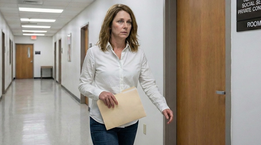 4日後、携帯電話が鳴って社会福祉局から至急来てほしいと言われると、エレンの胸に嫌な予感が広がりました。翌日、再び福祉局へ向かって廊下を歩くと、自分の足音がやけに大きく響きます。案内されたのは奥の個室で、ドアを開けると担当職員の隣にスーツ姿の警察官が立っていました。社会福祉の申請に、警察の立ち会いがあるなんて、ただ事ではありません。エレンは異様な雰囲気に気づきます。