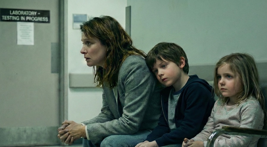ティンデルの提案で二度目のDNA検査が行われることになり、検査ミスの可能性というわずかな希望にかけて、別の検査機関でエレンが自費で依頼しました。白衣の技師が再び検査を行い、ライアンとソフィアも再度検査を受けます。技師が「結果は一週間後」と告げると、エレンは子供たちを連れて検査機関を出て、外は雨の中、傘を差しながら祈りました。しかし結果は変わりませんでした。