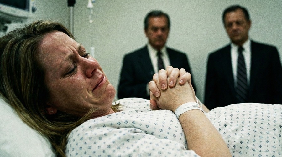 病院の入り口で自動ドアが開くと、エレンは受付に向かいましたが、また陣痛が襲ってきて壁に手をつきました。駆け寄ってきた看護師に車椅子に座らされて、エレベーターで上昇していくと、3階の産科病棟に着きました。廊下を進んだ分娩室の前に2人のスーツ姿の男性が立っており、裁判所記録官です。彼らは無表情にエレンを見つめており、エレンは車椅子から立ち上がって、開いた分娩室のドアをくぐりました。出産が始まろうとしていました。そして再び、科学がエレンを裁こうとしています。