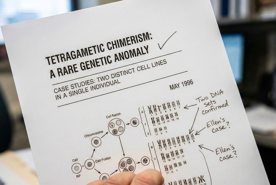 その夜、ティンデルが病室を訪れて医学論文のコピーを持ってきました。ボストンで起きた事例で、カレン・キーガンという女性も自分の子供とDNAが一致しなかったが、精密検査の結果キメラと判明したのです。人間の体に2つのDNA。ティンデルが「妊娠初期に双子だった可能性があり、片方がもう片方を吸収した結果、血液と卵巣でDNAが異なる状態になったのではないか」と説明すると、エレンはその論文を見つめました。理解できない言葉が並んでいますが、希望があります。エレンはわずかな可能性にすがりました。
