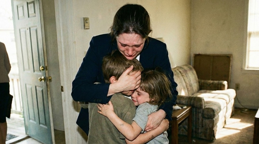 判決の翌日、児童保護施設を訪れたエレンは、面会室のドアが開くとライアンとソフィアが走ってくる様子を見ました。2人が抱きつき、ライアンの小さな手が背中を掴んでいます。ソフィアは声を上げて泣いており、エレンは2人を抱きしめたまま床に座り込みました。職員が赤ん坊を連れてくると、エレンは初めて我が子を抱きます。温かい体温、小さな呼吸、柔らかい肌を感じながら、3人の子供たちがようやく母親の腕の中に戻ってきたことを実感しました。