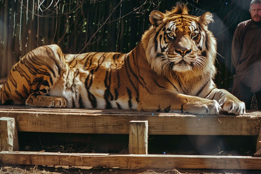 レオが保護されてから1年が経ちました。マークは記念日として、レオの体重を測定します。体重計の数字は200kg。マークは言葉を失いました。たった1年で、ここまで成長するなんて。通常の虎でも1歳で70〜90kg程度です。レオは明らかにその倍以上の速度で成長していました。「もう専門家に診てもらわないと」マークは決断します。しかしどこに相談すればいいのか、見当もつきませんでした。