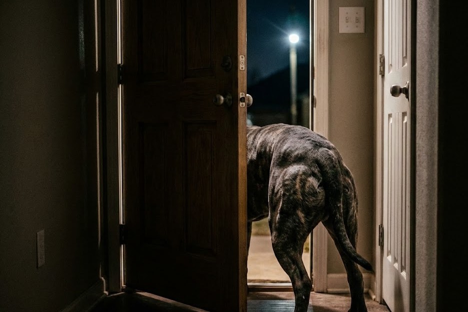 玄関のドアノブに、ラッキーが後ろ足で立ち上がり、異常な筋力を持つ前足で器用にノブを押し下げていたのです。ラッキーは音を立てずに夜の街へ消えていきました。サラの家のドアにはバネの仕掛けがついており、開いたドアは自動的に閉まる構造になっていました。もしラッキーが今晩だけでなく、これまでも今見たように外へ出ていたとしたら、その恐ろしい可能性に思い至ったサラは背筋が冷たくなりました。
