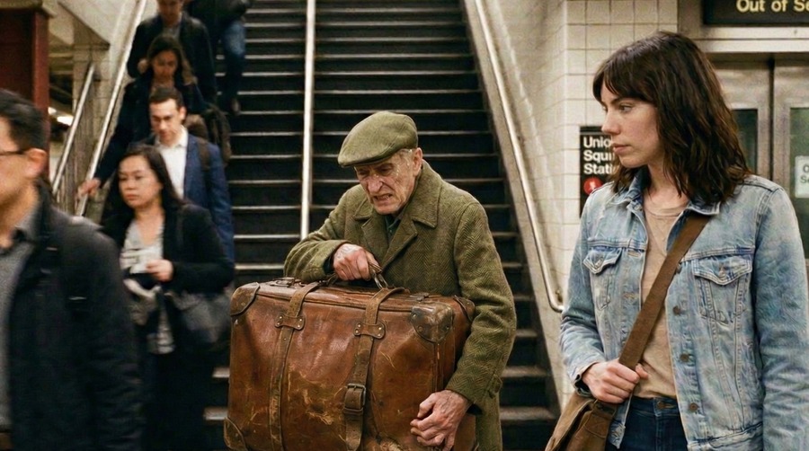 駅構内に入ると、エレベーターに「故障中」の表示が出ていました。エミリーは階段へ向かい、そして立ち止まりました。50段の階段の前に、一人の老人が立ち尽くしています。白髪で体は細く、巨大なスーツケースを両手で支えていました。周囲の人々は老人を避けて通ります。誰も声をかけません。足早に通り過ぎていくだけです。エミリーは老人の表情を見ました。困惑、疲労、そして諦め。老人の足は、わずかに揺れていました。なぜ、誰も助けないのでしょうか?