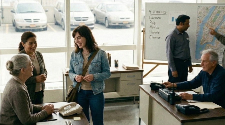 チェンからの支援で、エミリーは車両を3台追加し、合計4台体制になりました。ドライバーも増員します。52歳のカルメンは元看護師で患者ケアの経験が豊富。49歳のラジは元エンジニアで几帳面な安全運転が持ち味。45歳のマルコは元配送ドライバーでニューヨークの道を熟知しています。オフィス職も加わりました。元警察通信指令の68歳ハロルドと、元ホテルコンシェルジュの72歳エレノア。小さなチームに、家族のような絆が生まれていました。
