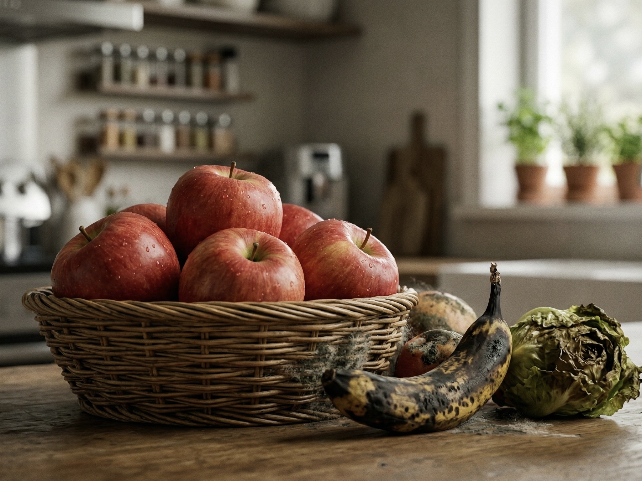 「フルーツボウルにりんごを飾る」という美しい光景の裏で、恐ろしい現象が起きています。りんごが絶えず放出している「エチレンガス」の存在をご存知でしょうか。これは周囲の野菜や果物の老化を強制的に早める、いわば”催熟ホルモン”です。一緒に置いておくだけで、隣の新鮮な野菜たちは自らどんどん腐敗への道を突き進んでしまうのです。りんごは必ず密閉袋に入れるか、専用の引き出しに完全に隔離してください。このひと手間で、冷蔵庫内の食材たちが連鎖的にダメになっていく悲劇を、根本から防ぐことができます。