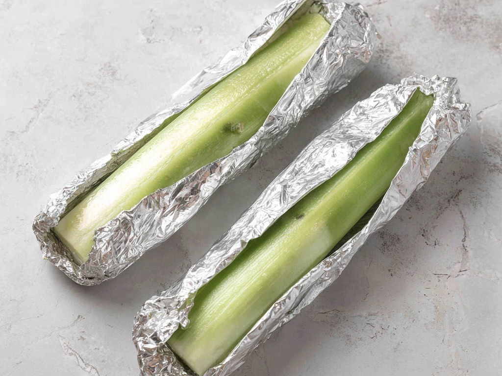 買ってきたセロリを、スーパーのプラスチック袋に入れたまま冷蔵庫へ放り込んでいませんか?それはセロリを自ら窒息死させているようなものです。プラスチック袋は、野菜が放出する老化ガスを内部に閉じ込め、腐敗を一気に加速させます。そこで登場するのが「アルミホイル」です。買ってきたらすぐにプラスチック袋を捨て、アルミホイルで全体をミイラのように隙間なく包んでください。適度にガスを逃がしつつ、必要な水分だけを完璧に保持する最強の防具となり、なんと1ヶ月以上もシャキシャキの歯ごたえを維持できます。